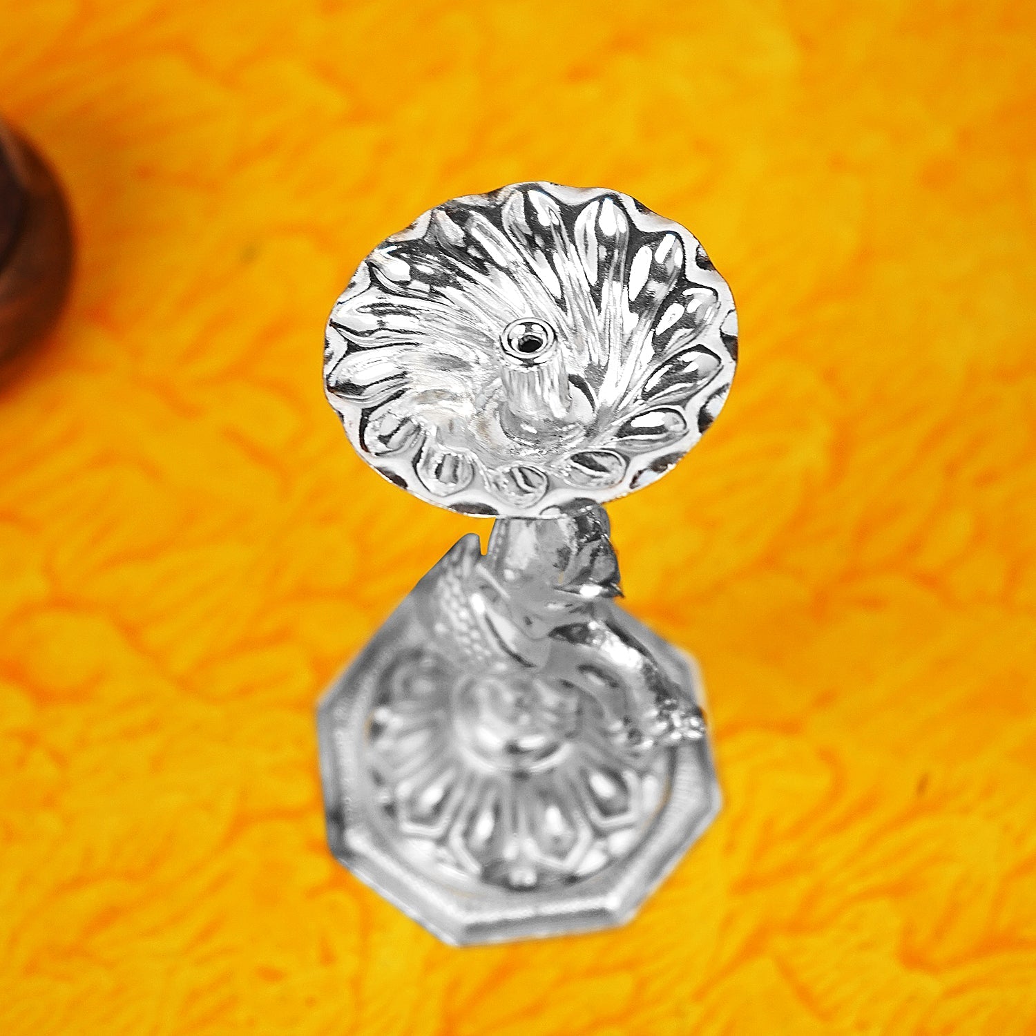 The Elephant Devdas Deepa, a beautifully made diya built from high-quality German silver, will add beauty with it's royal elephant holding a floral-shaped holder, the diya is not only useful for kindling spiritual light but also a beautiful decorative piece for your puja mandir. It's strong construction guarantees durability, and the design elevates any occasion. The diya adds elegance and holiness to your home and is ideal for creating light to the divine. Its unique design makes it an appropriate present for religious rituals and for special events.