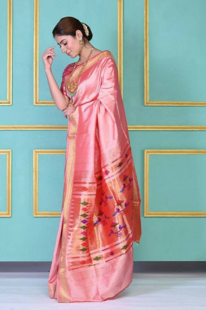 Very Much Indian Traditional Pretty Peach Pure Silk Double Pallu Paithani With Designer Peacocks Pallu - Grab2buy