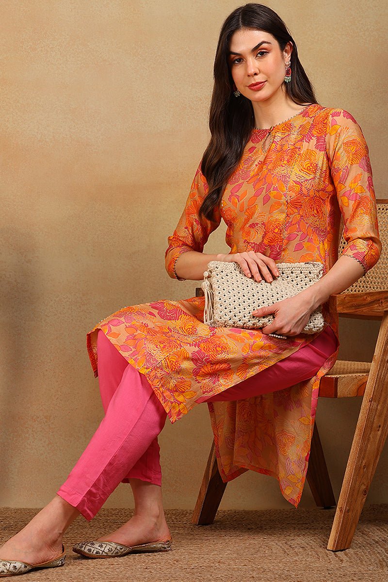 Ahika Beige & Orange Poly Silk Straight Kurta