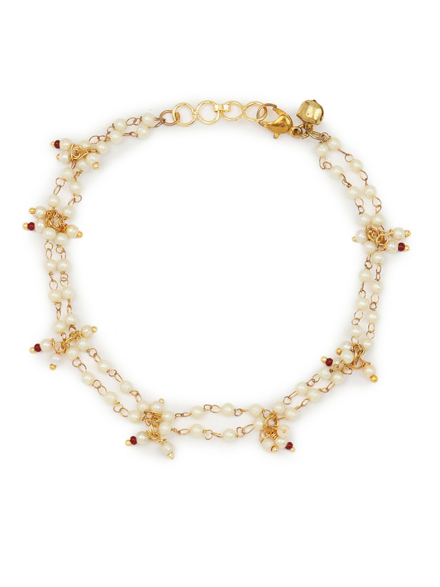 Gold-Plated White Kundan Studded Beaded Anklet - Ruby Raang - Grab2buy