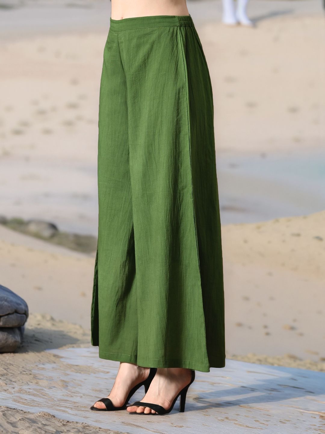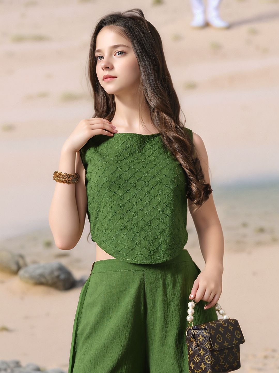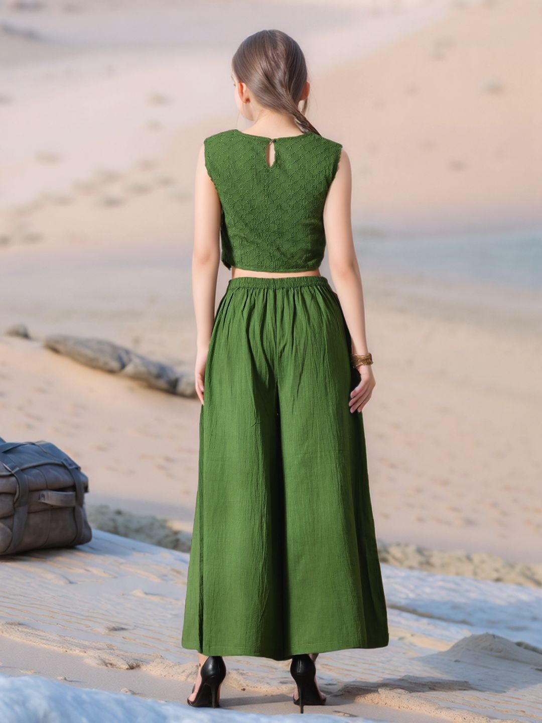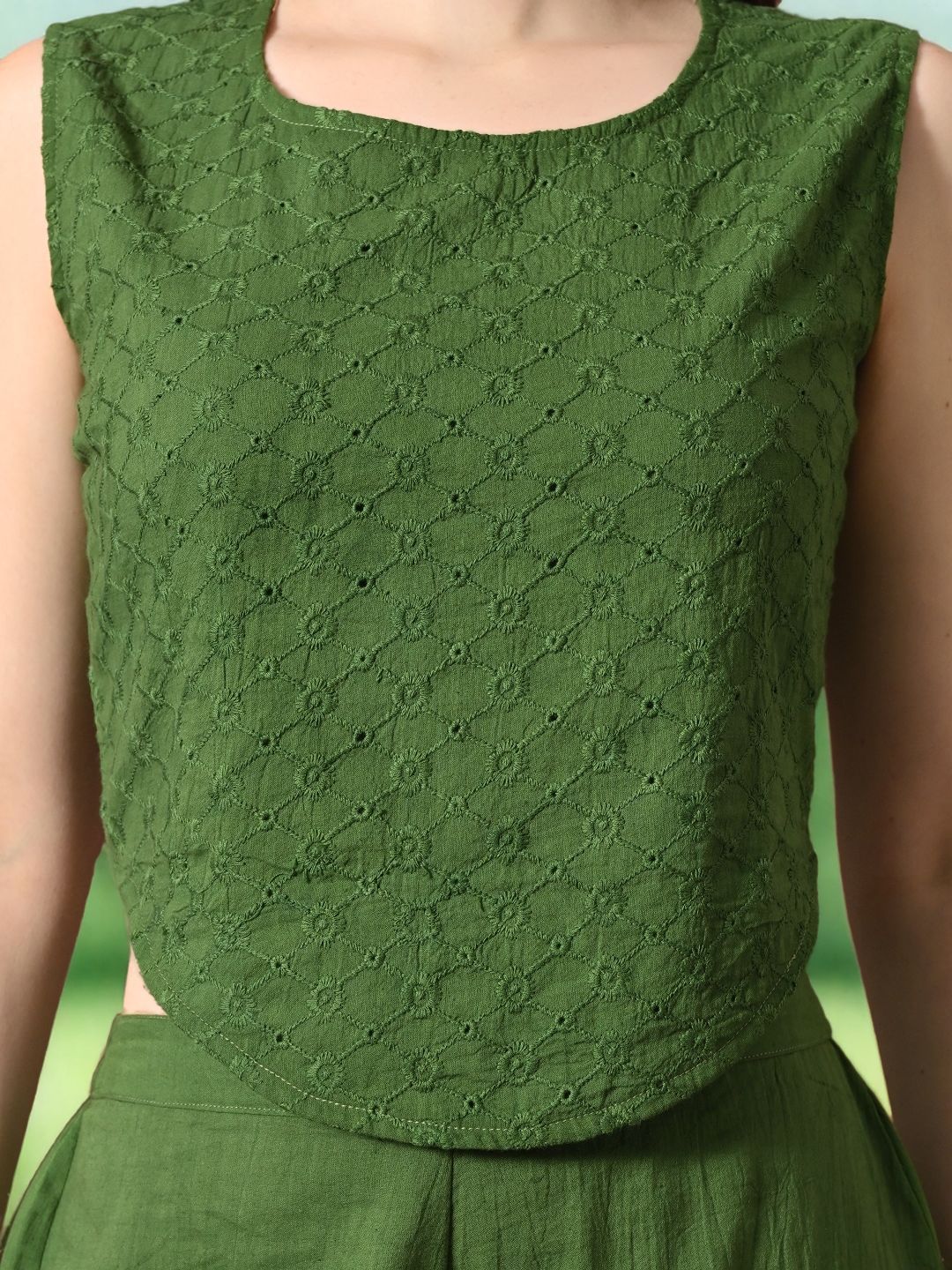 Myshka Girls Green Pure Cotton Sleeveless Schiffli Top with Flared Trouser