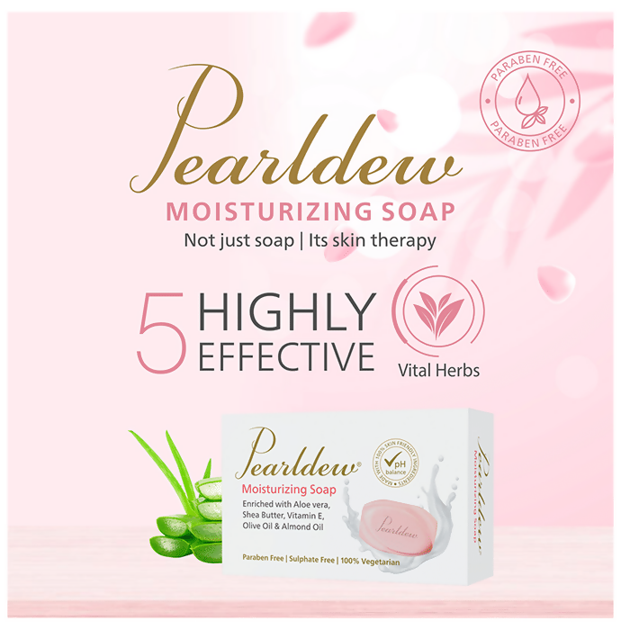 • Pearldew Moisturising Soap is a pure, delicate and gentle bathing bar. Its unique and rich moisturising properties penetrate deep into the skin and maintain the skin’s moisture level. It is packed with the goodness of plant extracts, organic herbs, and essential oils such as aloe vera, coconut oil, olive oil, kokum butter, vitamin E and more. It replenishes the skin with essential nutrients lost during baths. While maintaining the skin’s natural moisture barrier, it rinses without any heavy residue, leaving the skin feeling soft and clean. It does not cause any damage to the skin layers and does not have harsh stripping effects unlike a regular soap. It combats the proliferation of acne causing bacteria and prevents the occurrence of pimples, blackheads and whiteheads. The creamy lather of the soap coupled with mild fragrance will soothe the senses. It is pH balanced and suitable for all skin types.