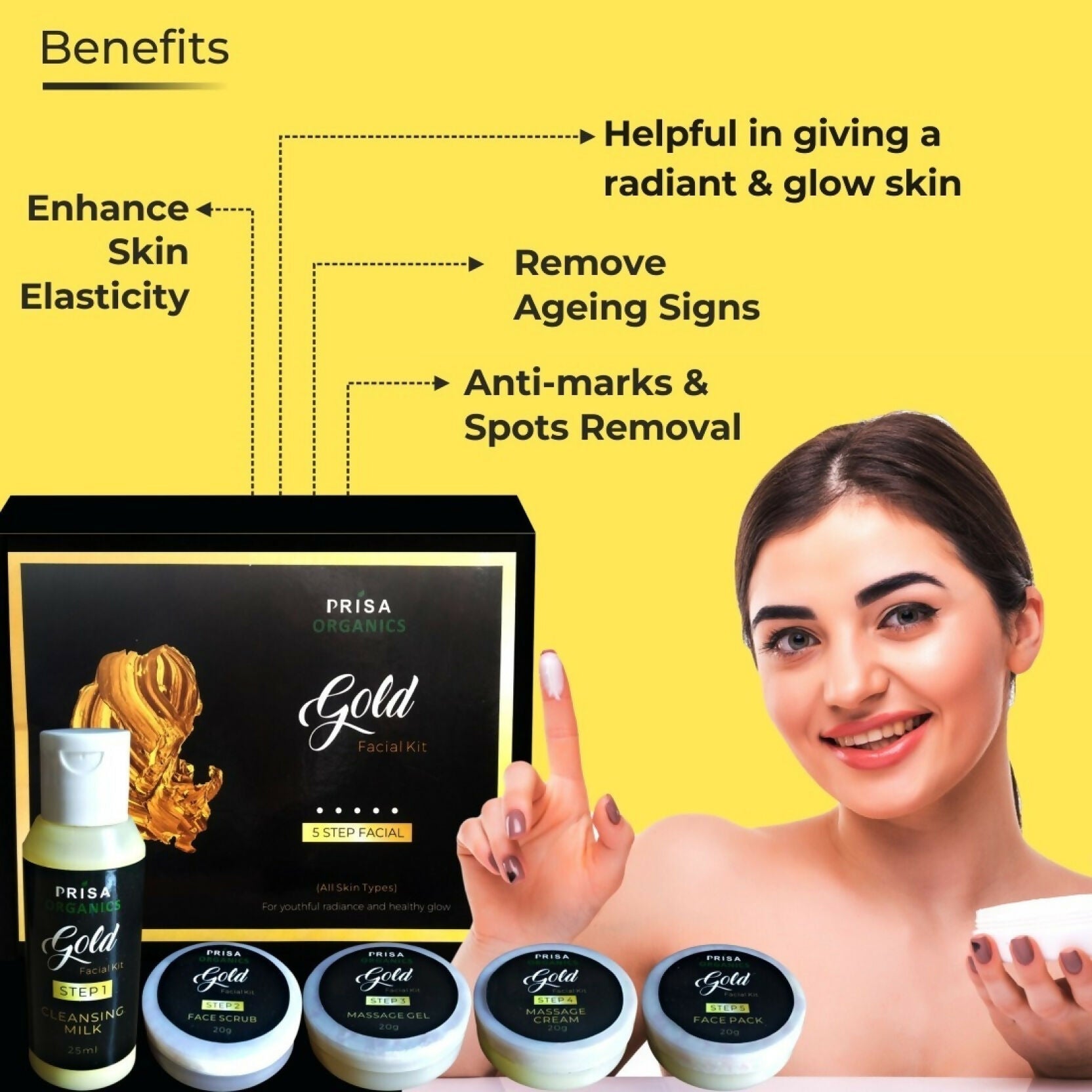 Prisa Organics Gold Facial Kit For Radiant & Glowing Skin - Cleanses & Rejuvenates Skin, Removes Dead Skin, Blackheads