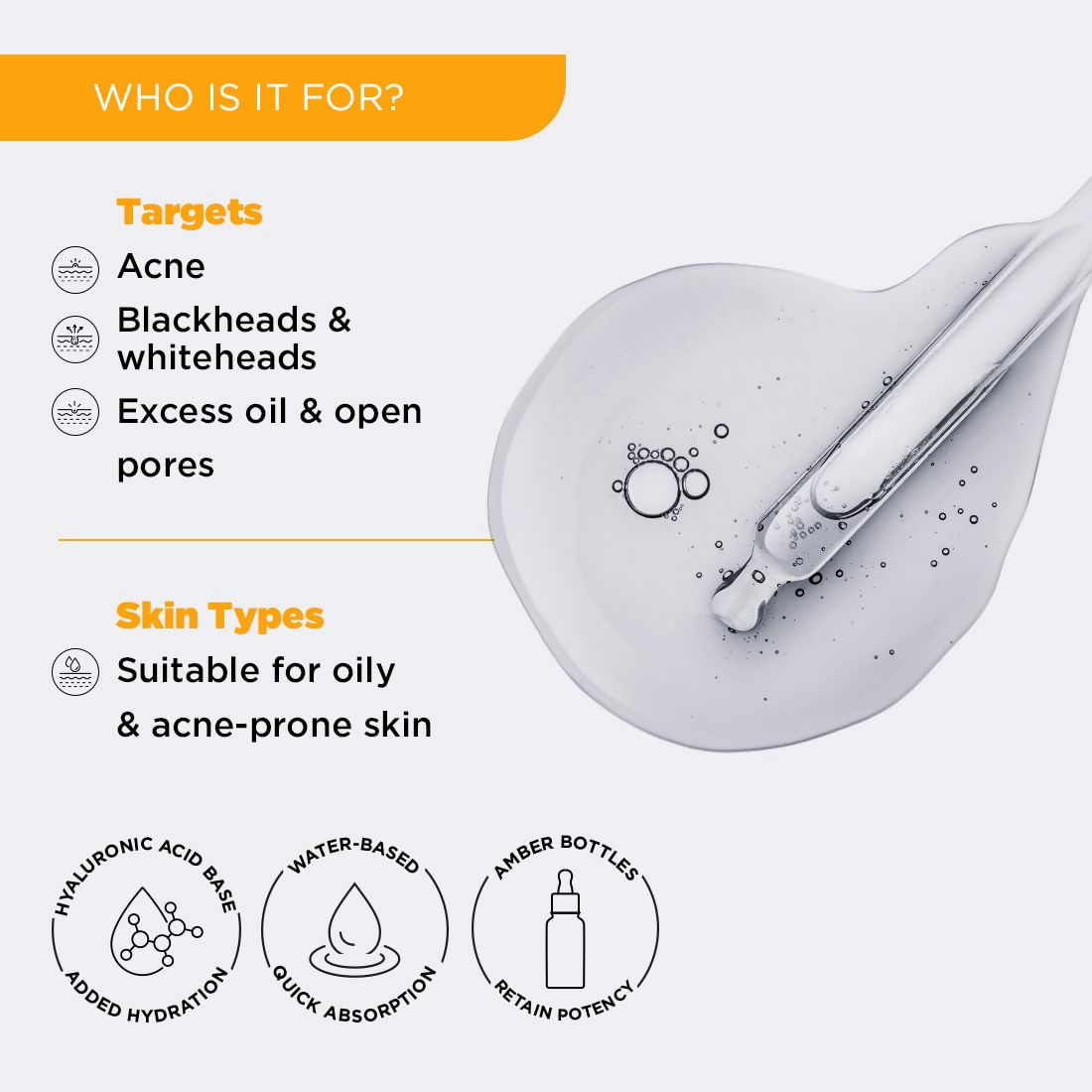 • After cleansing, apply 2-3 drops of 2% Salicylic Acid face serum at night. Spread it evenly using your fingertips and let it absorb completely. You can layer it with 2% Hyaluronic Acid serum from Sol, but wait 2-3 minutes between layering for better results. And don't forget to apply a moisturizer post its application. We always recommend using broad-spectrum sunscreen with SPF 30 or above every morning.