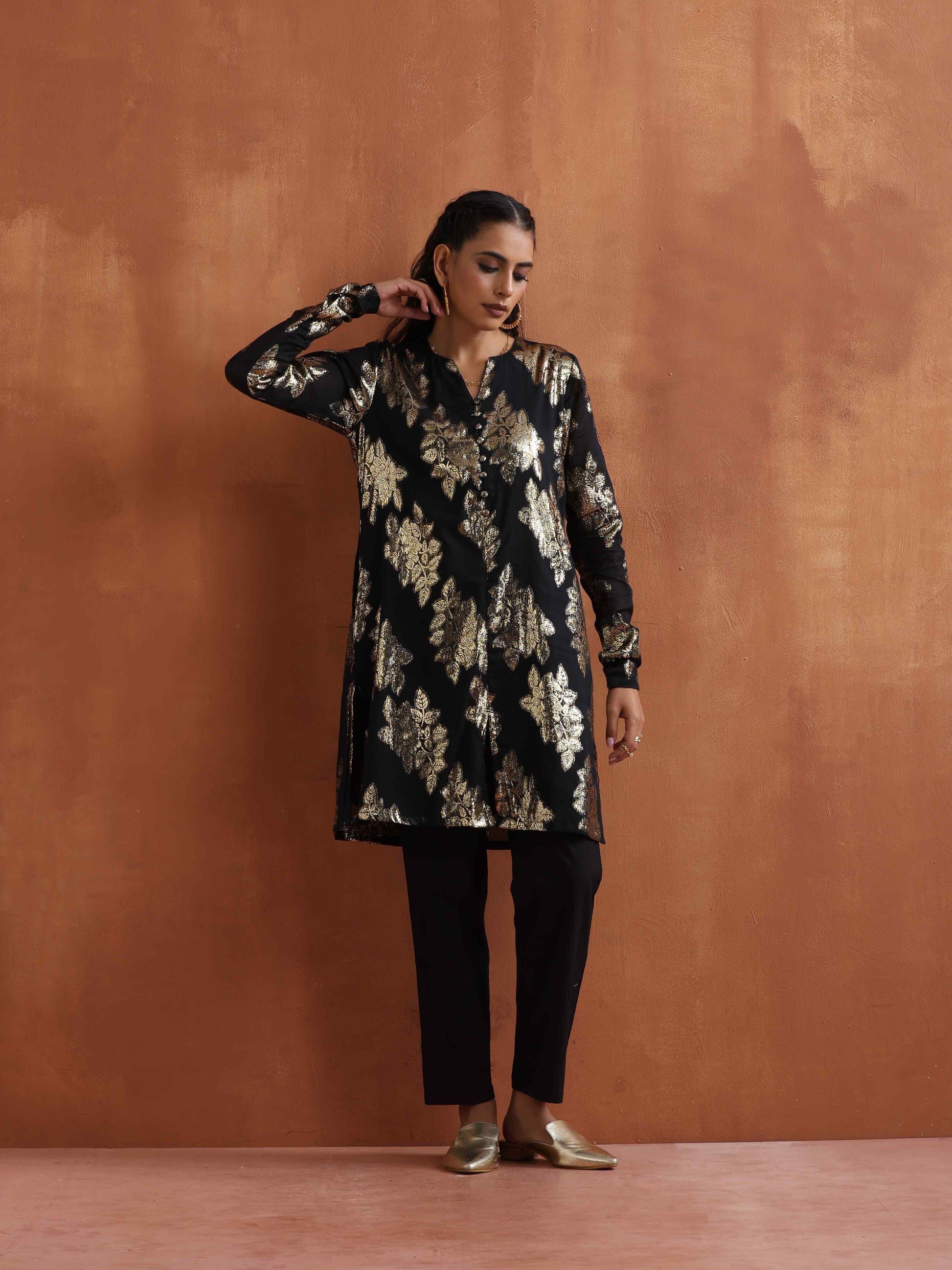 trueBrowns Black Metallic Straight Kurta Co-ord Set