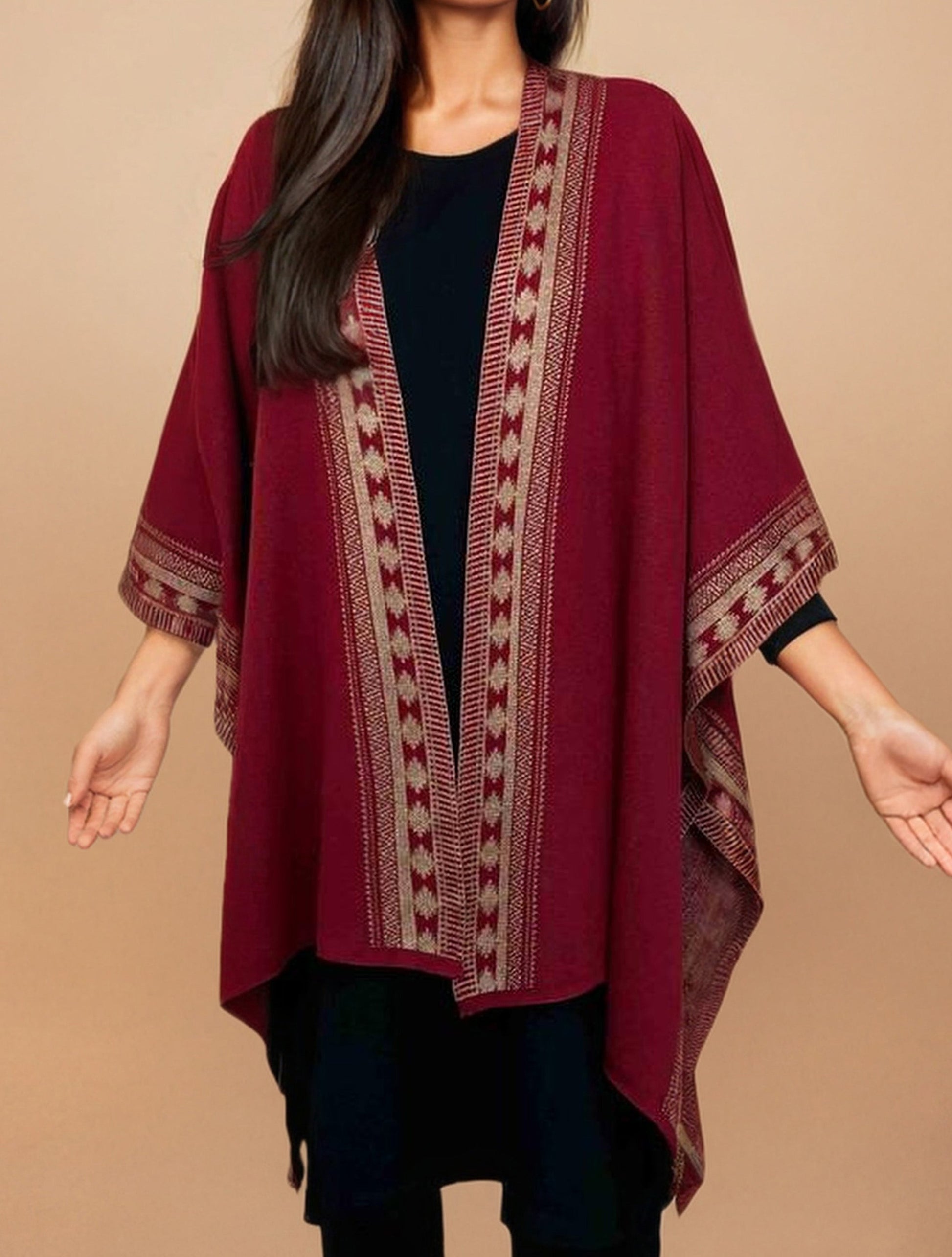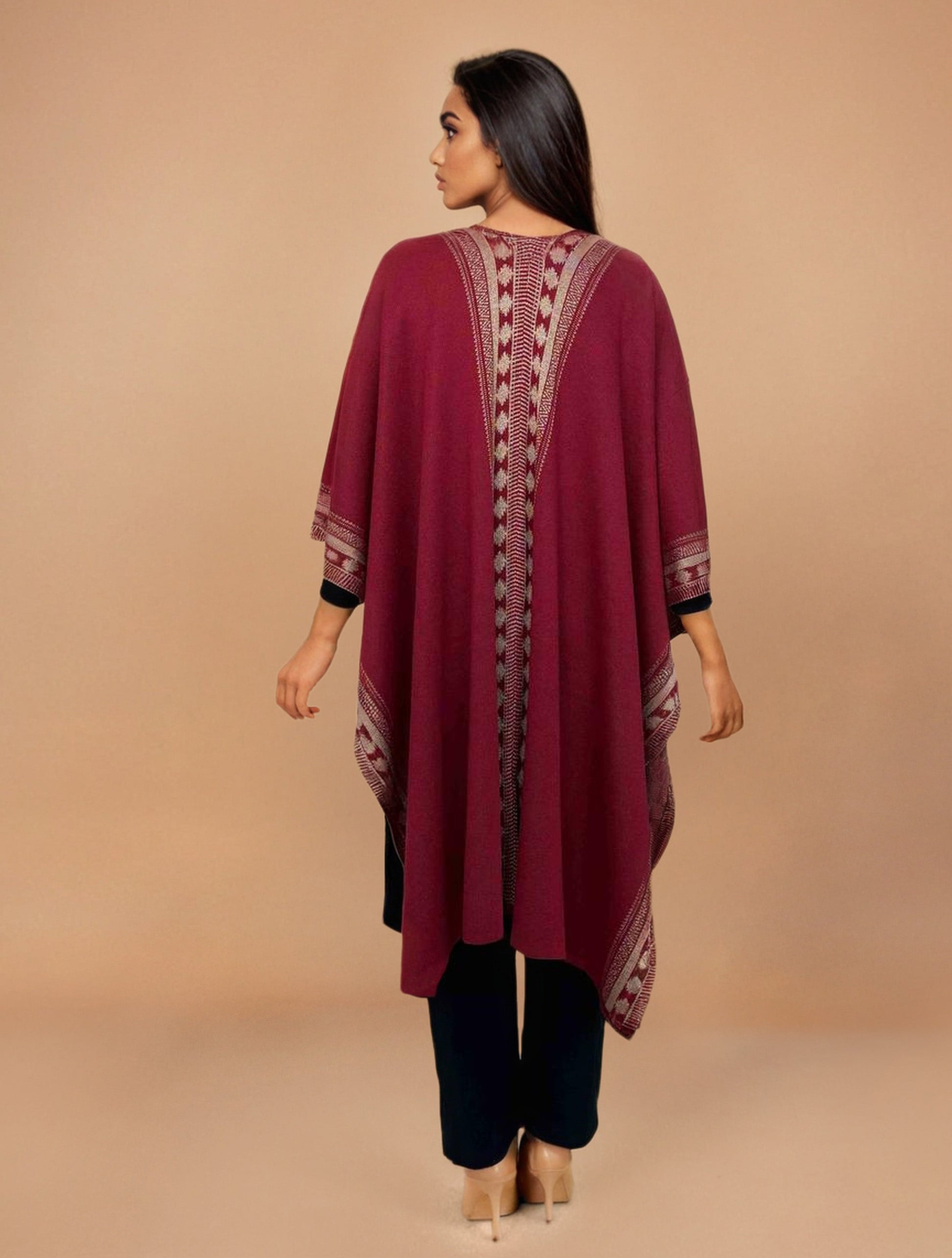 trueBrowns Maroon Woollen Geometric Kaftan Cape