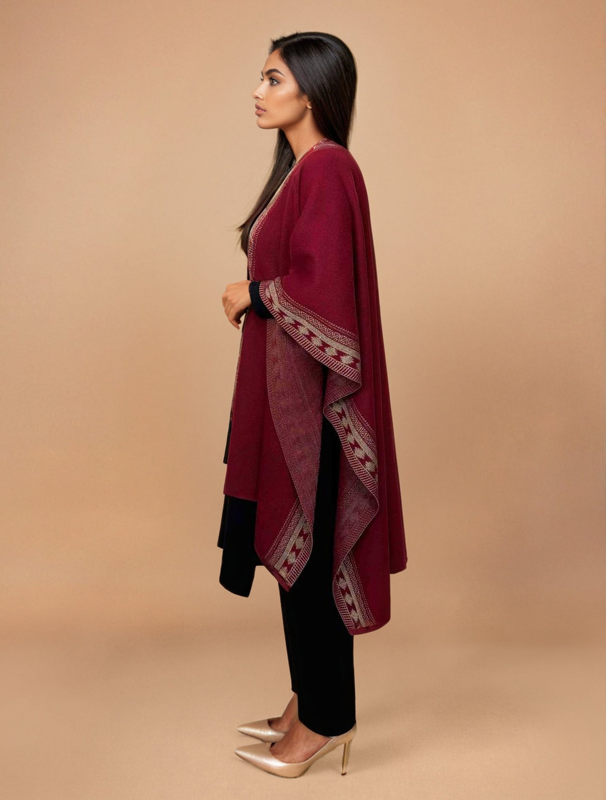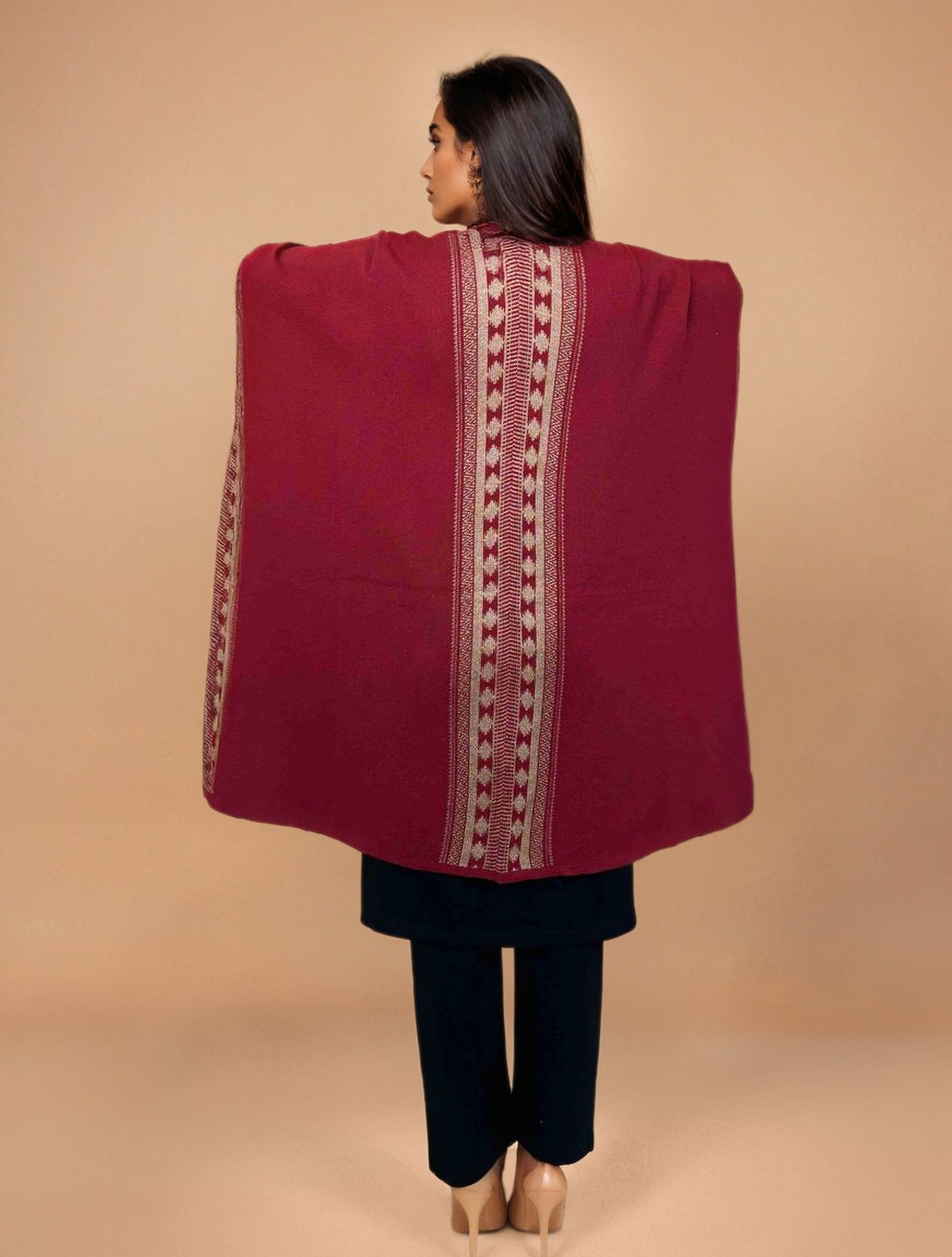 • Elevate your style with this maroon woollen geometric kaftan cape, it's an ideal blend of elegance and comfort.
