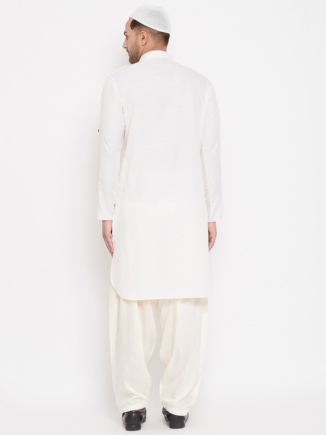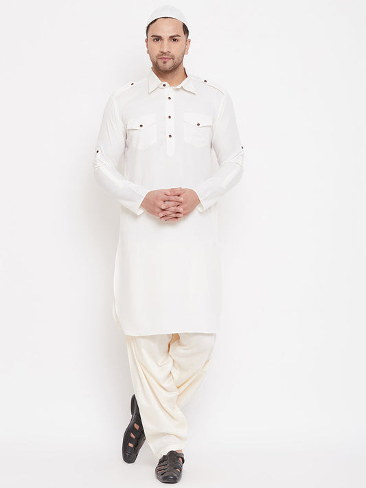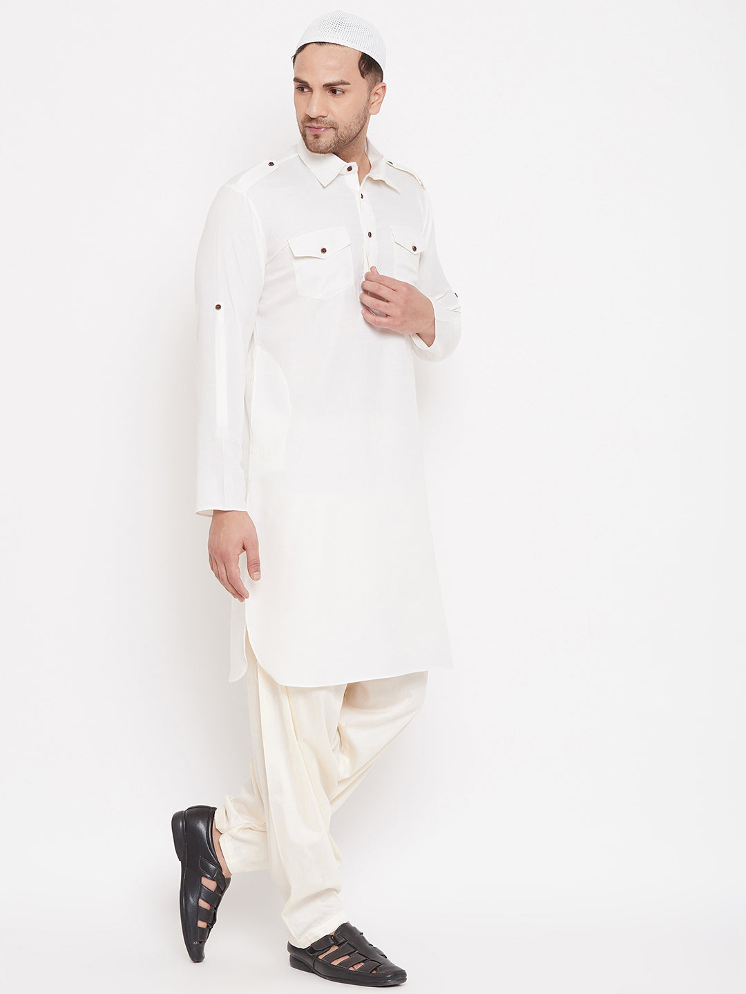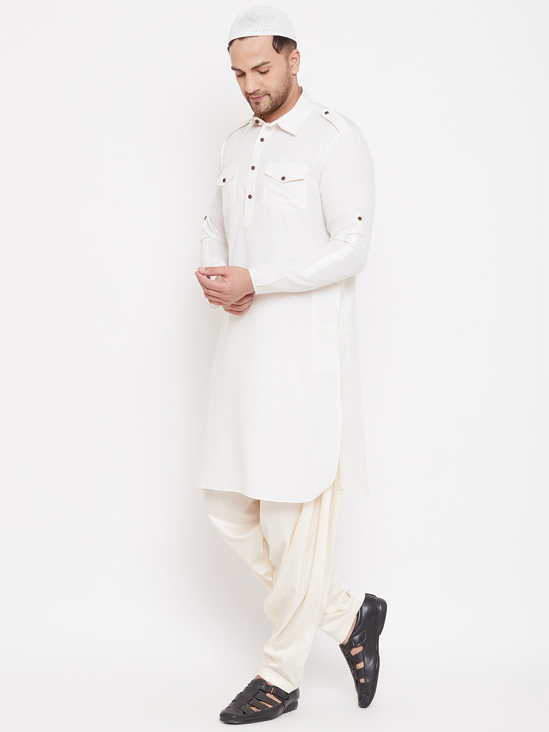 VM by Vastramay Men's Cream And White Cotton Blend Pathani Kurta Set