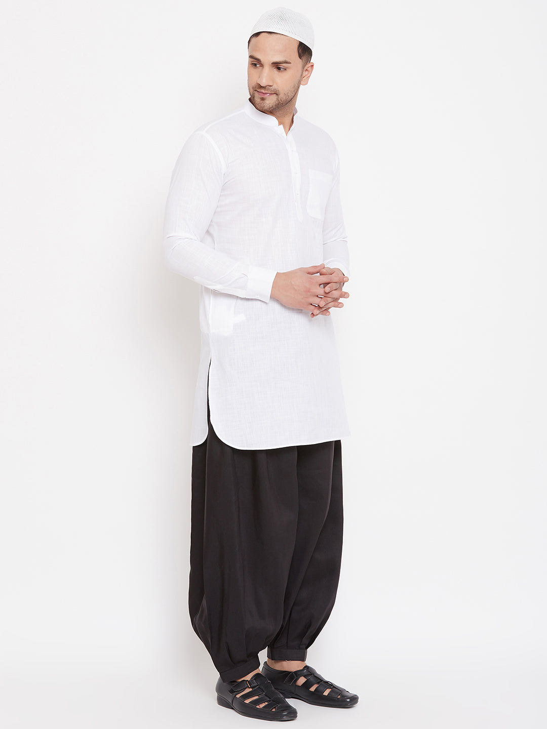 VM by Vastramay Men's White And Black Cotton Linen Pathani Kurta Set
